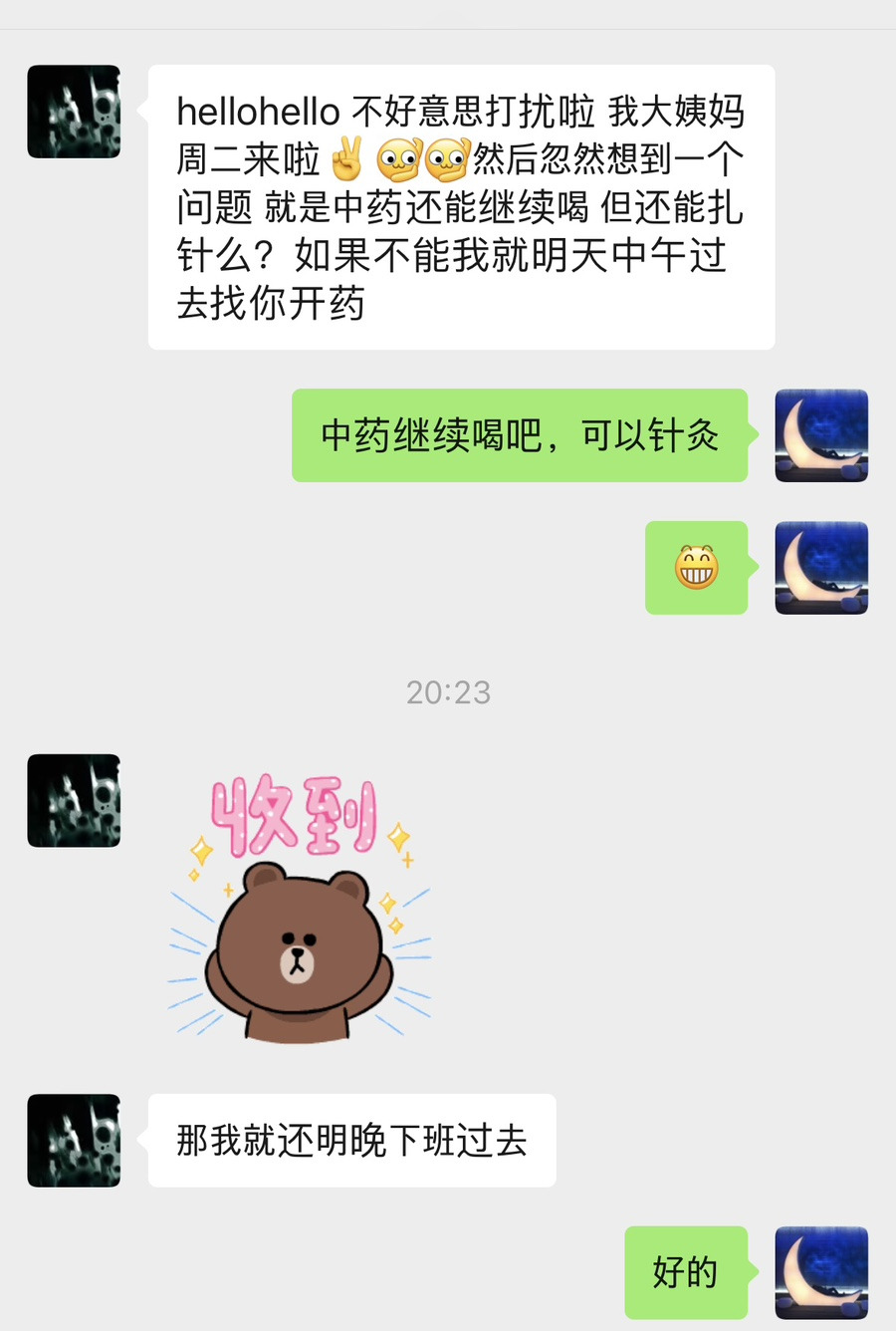 메신저가 왔다. 저녁 늦게 미안, 화요일(어제)에 월경이 시작됐다. 약 계속 먹어도 돼? 침 계속 맞아도 돼?약만 지어야 하면 내일 점심때 가고. 약도 먹고 침도 맞아도 돼. 그럼 내일 저녁에 퇴근하고 갈게. 오케 고마워. 내일봐, 내일봐 여, 40대 초반. 올해 4월부터 월경이 나오지 않았다. 벌써 6개월이다. 2달전 호르몬 검사 결과를 보고 나는 다낭성난소라고 의심은 하고 있다. 다만 초음파 검사가 없어서 확진하긴 어렵고, 의심 뿐이다. 2개월째 일주일에 1~2번 침 맞고 탕약으로 치료 중이었다. 지난 달에도 치료 중이었지만 월경이 나오지 않았고 이번달도 지나가나 싶었는데어제 그 분이 오셨다. 大姨妈=큰이모, 월경을 큰이모라고 말하곤 한다. 왠지는 모르겠지만.. 좋은 뜻은 아닌데잔소리하며 괴..